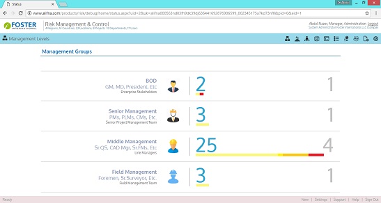 You can view the entire risk register in your organization under various management accessibility levels , from the CEO to Field Management. RimpeX allows you to configure management levels 3, 4 or 5 depends on your organization structure. The KPIs will be calculated based on the user’s management group identifier.