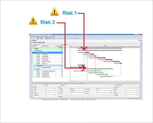 You can see the impacted activity due to one potential risk with its successors and milestone activities in the standard Gantt chart under various WBS. You can simulate graphically the impact on the project by a single click.